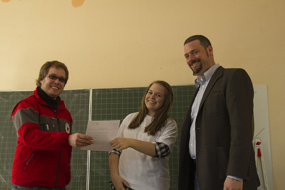 Die neuen Schulsanitäter: Leonie Dissemond, Alexander Badzinski, Lukas Eich, Tim Schiffman, Laura Wolff, Johanna Oppermann, Verena Porschen, Alina Kämmerling, Kristina Bocharov, Dominik Rhien, Robert Bergmann, Ronja Gaul, Laura Schian, Elena Mews, Laura Pannier, Jan Matheja, Jan Rudolph, Markus Vey, Marius Blumenthal, Marius Braun, Isabelle Kann, Ugurcan Ceylan, Philipp Ruland und Robin Pütz