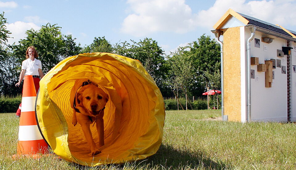 Die Rettungshunde des DRK sind übrigens die einzigen Hunde, die auf dem Gartenschaugelände zugelassen sind. Und wie im richtigen Einsatz, lässt Hundeführerin Melanie Rarey ihre Labrador-Hündin Aika frei, also ohne Leine über die Hindernisse klettern. „Weil wir mit den Hunden auf freie Suche gehen, tragen sie eine Kenndecke mit dem roten Kreuz des DRK, damit sie von Fremden oder beispielsweise Jägern als Arbeitshund im Einsatz erkannt werden“, erläuterte Küpper.