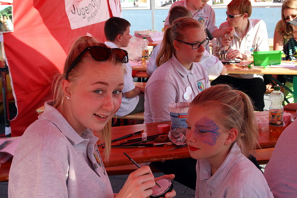 Richtig viel zu tun gab es während des Rotkreuz-Aktionstages auf der Landesgartenschau auch für die Jugendrotkreuzler und die Erzieherinnen der DRK-Kindergärten. Sie hatten an der Römerbastion ihre Zelte aufgeschlagen und luden zum Kinderschminken ein oder zeigten kleinen und großen Besuchern, wie aus einem kleinen Samenkorn im eigenen Gemüsebeet Erbsen oder Tomaten wachsen. Im Duftgarten lernten die kleinen Gartenschau-Besucher die besonderen Düfte verschiedener Kräuter kennen oder lernten Wissenswertes über Wind- und Solarenergie.