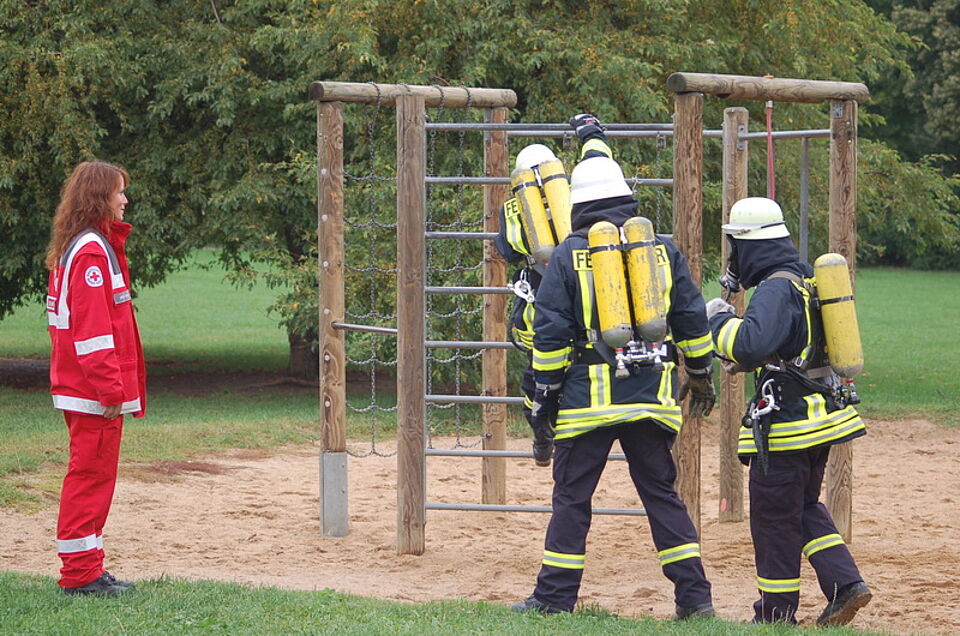 Denn die Pressluftflaschen sind schwer und das Atmen durch den Atemregler ist kraftaufwendiger. Dazu müssen die Teilnehmer einen kräftezehrenden Übungsparcour bewältigen. "Da kann es auch schon einmal vorkommen, dass der Kreislauf nicht mehr mitspielt und einem Kameraden schlecht wird", so Karina Geuenich.