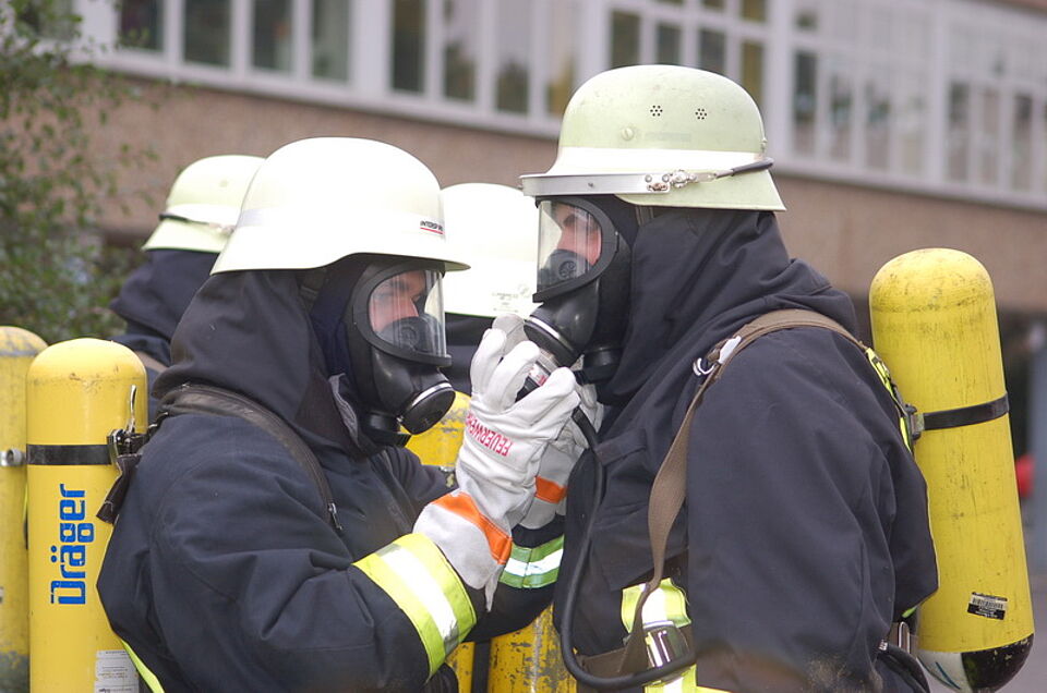 In kleinen Gruppen mit jeweils acht bis neun Einsatzkräften werden die Feuerwehrleute langsam an die ungewohnte Arbeitsweise mit den umluftunabhängigen Atemschutzgeräten herangeführt - eine ziemlich anstrengende und schweißtreibende Arbeit.