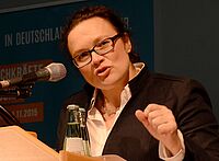 DRK-Kreisgeschäftsführer Rolf Klöcker erklärt bei Veranstaltung der VR-Bank Nordeifel mit Bundesarbeits- und Sozialministerin Andrea Nahles in Mechernich den Beitritt zum INQA-Audit, der Initiative…