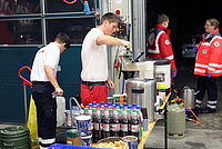 Im Feuerwehrgerätehaus Bad Münstereifel errichtete das Rote Kreuz eine Verpflegungsstation – 60 Rotkreuz-Helfer versorgten die Einsatzkräfte mit Getränken und Essen – Rotkreuzler aus dem Kreis…