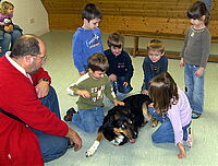 Rotkreuz-Besuchshund „Lena“ eroberte die Herzen der Kinder vom Ripsdorfer Kindergarten im Sturm – Die Kleinen lernten viel Wissenswertes rund um den Vierbeiner.