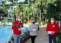 1500 Corona-Schnelltests übergab Mirja Bernardy, Geschäftsleiterin der Therme Euskirchen, an Rolf Klöcker und Thomas Heinen vom Rotkreuz-Kreisverband