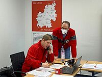 Landrat Markus Ramers machte sich im Rotkreuz-Zentrum ein Bild vom Alltag der Hotline-Mitarbeiter und griff selbst zum Hörer – Keine Impftermine oder medizinische Beratung