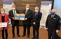 Mechernicher Arzt und Corona-Koordinator Frank Gummelt nimmt Spende der beiden Lions Clubs im Kreis Euskirchen gemeinsam mit Führungsstabchef Udo Crespin und Landrat Rosenke entgegen – Verwendung u.a.…